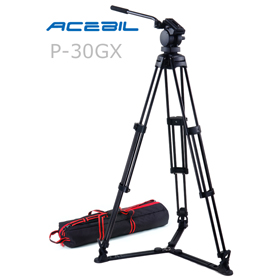 The P-30MX Professional Tripod System includes a 75mm H30 fluid head, T750 aluminum tripod, MS-3 mid spreader, RF-3 rubber feet, and an S-50 carry case.