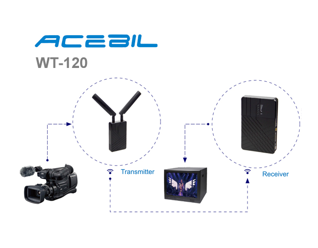 WT-120 Wireless TransmitterThe Acebil WT-120 Wireless Transmitter provides a seamless wireless connection for distances up to 120 meters. It supports 1920 x 1080p / 60 fps at full resolution. Use up to 4 sets simultaniously with no interuption.