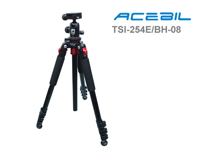 TSI-254E/BH-08The TSI-254E/BH-08 Professional Photo Tripod System features a 180 degree folding design for traveling. Built-in bubble level for precise positioning. Friction Control System allows you to modify the level of friction on the ball to accommodate changing equipment weight. Adjustable leg angles can be independently locked into place at three different angles and a Multi-Angle Central Column. Alloy body minimizes weight. Dual threaded head platform assures compatibility with almost any tripod head and camera. Alloy body with aluminum leg pipe & adjustable foot spike. Features large foam grips on all three legs for all-weather use.